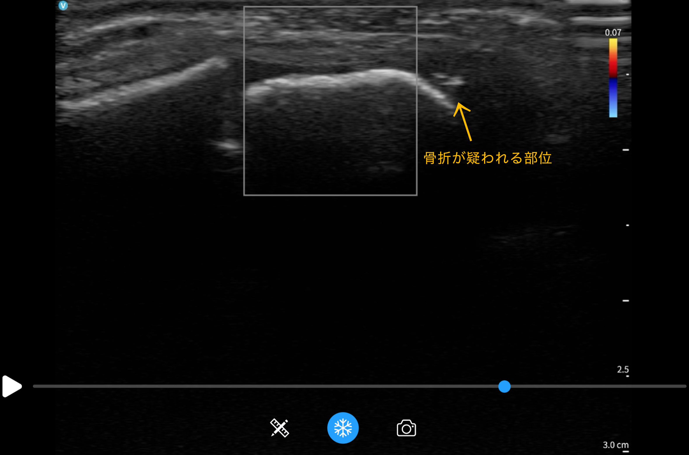 エコー画像で確認したところ、腓骨の下端部分に骨の連続性が乱れている部分が確認されました。