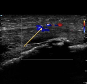エコー上 :膝蓋腱表層に低エコー像+、ドプラー+